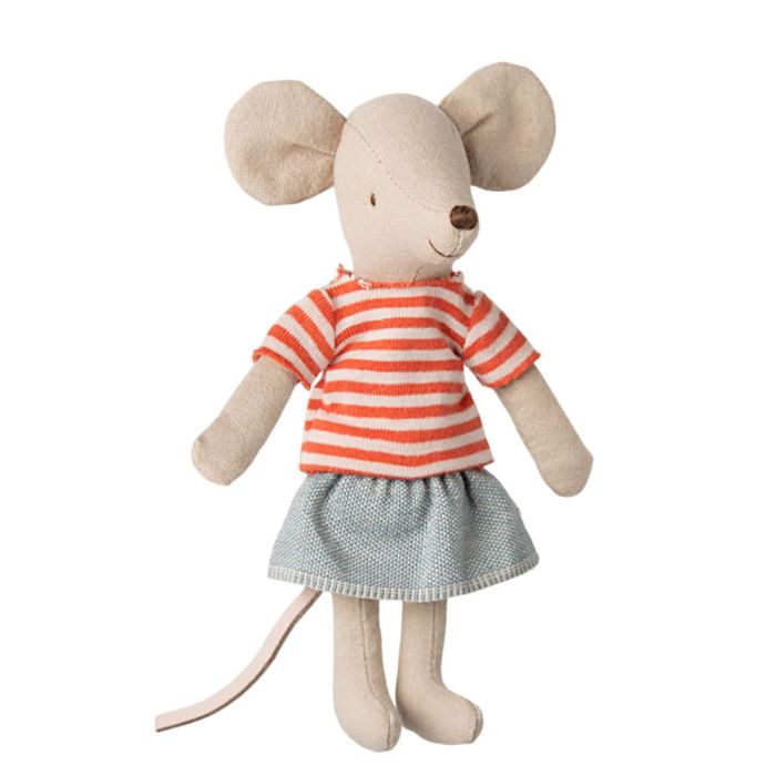 Maileg grote zus met magneten in haar handjes, gestreept shirt en spijkerrokje aan.
